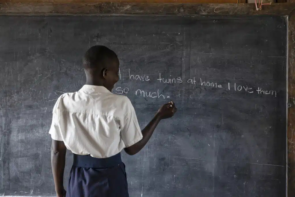 Escribiendo con atención en su cuaderno de biología, Nalongo inclina la cabeza cada vez más sobre el pupitre. Las clases han terminado, pero ella quiere acabar los deberes en el colegio antes de emprender el camino a casa. “En cuanto llegue, los gemelos querrán estar en mis brazos y tengo que liberar a mi madre para que pueda ir a trabajar. En casa, no puedo hacer los deberes”, explica.