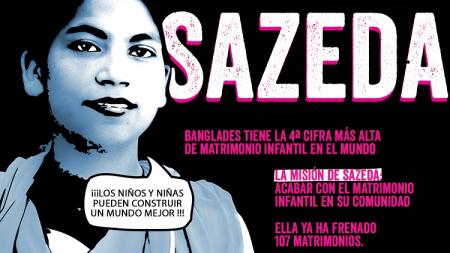 Aunque sólo tiene 16 años, Sazeda ya ha conseguido interrumpir 107 matrimonios infantiles en Bangladesh mediante su colaboración con Plan International. Cuando ella tenía 14, sus padres ya querían buscarle un marido, pero ella consiguió disuadirlos para que le permitan seguir estudiando y dejar el matrimonio para después.