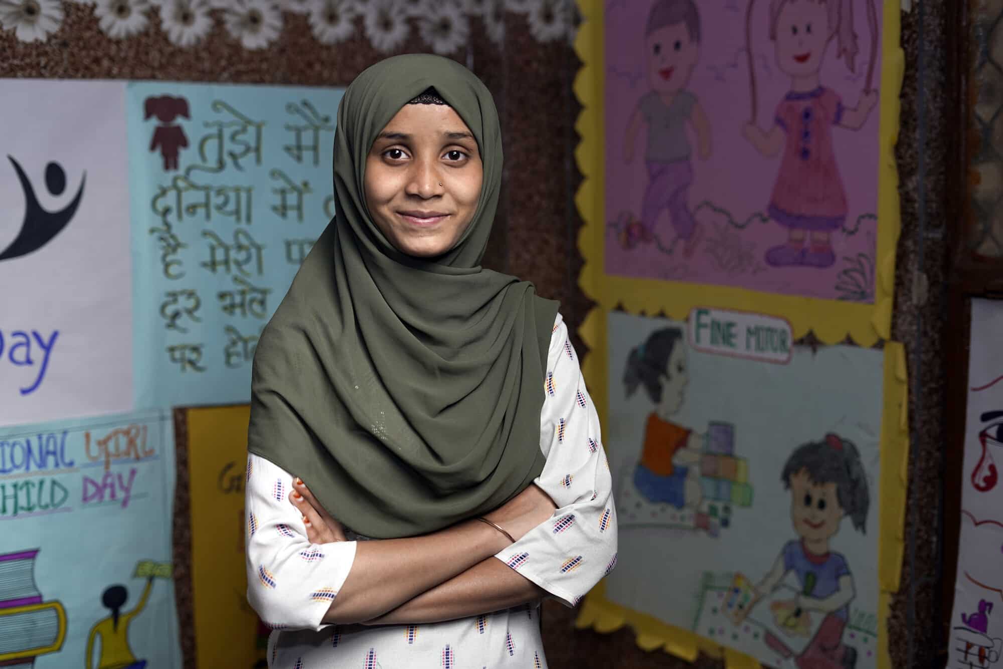 Afsana, de 18 años, migró con su familia desde Bihar en busca de un futuro mejor. Recibió una beca completa para estudiar inglés y ahora enseña a sus hermanas pequeñas. Sueña con trabajar en el extranjero como trabajadora social. “La educación fue difícil, pero siempre supe que quería ayudar a otras niñas. Plan International me dio el rumbo. Hoy soy una líder en mi comunidad”, concluye.