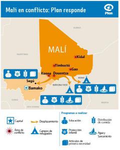 PLAN Internacional distribuye alimentos, atención psicológica y activa escuelas de emergencia en Segú, la quinta ciudad del país que se ve desbordada por la llegada de desplazados, la mayoría mujeres y niños y lanza una petición de fondos de 2,6 millones de euros para poder atender a la población en los próximos seis meses.