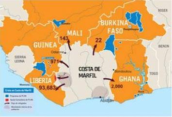 • Madrid, 5 de abril de 2011Más de 53.000 niños, niñas y adolescentes marfileños han cruzado la frontera y se han refugiado en Liberia huyendo de la escalada de violencia que afecta a Costa de Marfil desde las elecciones presidenciales de noviembre de 2010. PLAN, la organización internacional que protege los derechos de la infancia, advierte de que este éxodo (hay más de 90.000 refugiados marfileños y un millón de desplazados internos) pone en riesgo la seguridad y el bienestar de los menores, que suponen el 59% de los refugiados procedentes de Costa de Marfil, según cifras de la ONU.
