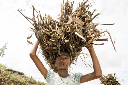 Salma, de 12 años, cargando palos
