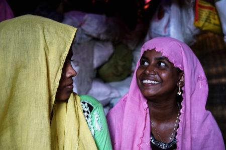 Ariza y Samira recién llegadas a Cox´s Bazar. En su huida de Myanmar, las familias rohingya han perdido prácticamente todas sus pertenencias. Muchas de las adolescentes se ven recluidas y con vergüenza de salir sin elementos básicos como ropa interior o un pañuelo o burka con el que poder cubrirse, un requisito indispensable para poder salir cuando comienza la pubertad.