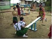 Paralelamente, en el pueblo de Tae Tae Ku, donde ocho estudiantes murieron en el ciclón, ahora los niños juegan en los balancines en el patio de su recién estrenada escuela que PLAN ayudó a construir con la comunidad. Ahora hay unos baños limpios higiénicos en vez de los insalubres hoyos que tenían que usar antes. Win, estudiante de cuarto grado en la nueva escuela, dice ?Ahora, sólo pienso en ir a la escuela, para estudiar y jugar en el nuevo patio?.