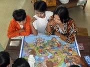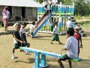 Unos niños en una de las zonas de juegos construida tras el paso del Nargis por Myanmar.