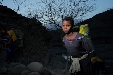 La sequía provocada por el fenómeno El Niño en Etiopía está teniendo un grave impacto en la vida de millones de niños y niñas. Niñas como Mirte, de 14 años, tienen que hacer todo lo que pueden para ayudar a su familia a salir adelante. Se ha convertido en la encargada de conseguir agua. Dos veces a la semana, Mirte baja desde su casa en el monte hasta la última fuente de agua que queda, en el valle. Cuando llena sus recipientes con el agua que consigue encontrar, emprende el camino de vuelta cargada con un pesado bidón amarillo a la espalda. Es una tarea dura y peligrosa, que expone a los niños y niñas a violencia y abusos. Mirte, de 14 años, vive con sus padres en las laderas de las tierras altas de Etiopía, en la región de Amhara. La tierra es árida y seca y el fenómeno El Niño ha agravado la situación. La sequía afecta a 10.2 millones de personas en Etiopía. La organización internacional comprometida con los derechos de la infancia Plan International está distribuyendo alimentos, agua, saneamiento y apoyo sanitario para niños y niñas como Mirta y otros grupos de población vulnerable en la región. El agua escasea y muchos ríos y arroyos se han secado. La tarea de recoger agua suele recaer sobre los niños y niñas. “Es duro vivir en las montañas”, dice Mirte. “Me levanto a las 4 de la mañana para ir a por agua. Está oscuro y me da miedo”. Cada día, grupos de mujeres, niños y niñas hacen este complicado camino descendiendo por la montaña para recoger agua. “Es más seguro ir en grupo”, dice Mirte. “Por eso hemos inventado códigos de silbidos para avisarnos de que es hora de levantarse y poder ir unas cuantas chicas juntas”. Las mujeres, con niños y niñas a sus espaldas, se unen al grupo, al que acompañan unos cuantos burros, cargados con contenedores de metal improvisados que pueden cargar hasta 80 litros de agua. El camino hasta el lecho de agua es de unos tres kilómetros y a veces un viaje no basta. “A veces hago varios viajes al río, casi tres kilómetros por la ladera empinada y arenosa para conseguir el agua que necesitamos durante un día para beber y utilizar en casa”, dice Mirte. El viaje es cansado y peligroso: frío en las mañanas y caluroso en las tardes. A veces Mirte y sus vecinos tienen que esperar en los pozos a recargar hasta que consiguen suficiente agua para llevar a sus casas. “Cargo con un bidón de 20 litros a la espalda cada vez”, dice Mirte. “En el lecho del río cavamos pozos poco profundos, hacemos una fila y vamos cogiendo agua por turnos. Con la sequía el nivel del agua es mucho más bajo y tenemos que cavar más. Si llegamos tarde, los pastores van antes y le dan el agua al ganado, por lo que después está contaminada”. El viaje de Mirte para recoger agua tiene un gran impacto en su educación – y en la de muchos otros niños y niñas. “El viaje es tan largo…si cojo agua por la mañana, pierdo colegio. Tengo que faltar dos días a clase cada semana para ayudar a mi madre a conseguir el agua suficiente. Cuando voy al colegio, duermo hasta tarde porque tengo que recoger agua después. No me da tiempo a hacer los deberes”. Las niñas como Mirte pierden innumerables días de colegio, algunas se quedan atrás y otras abandonan la escuela. La vida escolar está llena de dificultades, debido a la sequía provocada por El Niño. “No hay agua en el colegio. Mis amigas y yo no vamos a clase cuando tenemos la regla. No hay lavabos y es vergonzoso llevar un recipiente de agua al baño, todo el mundo habla de ti.” Este año la vida ha sido especialmente dura porque la estación seca ha durado demasiado tiempo. A Mirte no le gusta quejarse pero los cansados viajes en busca de agua empiezan a tener impacto en su cuerpo. “Sé que no debería quejarme de tener que recoger agua, pero a veces siento un dolor muy fuerte en el pecho, en los hombros y en los pies”, explica. Aunque Mirte sigue teniendo esperanzas de que la situación cambie. “Si la lluvia volviera, como antes, no tendríamos que hacer este camino tan largo a por agua. Iría al colegio todos los días”, dice. “Me siento triste cuando subo la ladera con mi bidón y veo a mis compañeros yendo al colegio, aunque saber que volveré a ir a clase con ellos al día siguiente me da esperanzas”. Plan International trabaja en Etiopía en la distribución de ayuda de emergencia para niños, niñas y mujeres durante la peor sequía que ha vivido el país en décadas. La organización apoya a los niños y niñas y a las mujeres en la distribución de comida, nutrición de emergencia, semillas, agua y apoyo en saneamiento e higiene. También trabaja con el gobierno y otras agencias para supervisar el estado de los niños y niñas, sus familias y la población más vulnerable. La organización ha suministrado ayuda a más de 27.000 niños y niñas y alrededor de 25.000 mujeres embarazadas para asegurar que tienen acceso a alimentos en las regiones de Oromia, Amhara y las Naciones, Nacionalidades y Pueblos de Sur