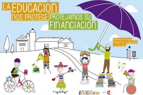 La Campaña Mundial por la Educación (CME), bajo el lema “La Educación nos protege, protejamos su financiación”, se moviliza para solicitar a los representantes políticos que cumplan sus compromisos internacionales y destinen los recursos necesarios para financiar el derecho a la educación en todo el mundo. En el mundo hay 124 millones de niños, niñas y jóvenes sin escolarizar. 52,9 millones están en África Subsahariana, 50,9 millones en Asia y Pacífico, 6,6 millones en América Latina y el Caribe, 8,7 millones en los Estados Árabes y 5 millones en el resto de países del mundo. En 2015, 196 Estados firmaron los Objetivos de Desarrollo Sostenible (ODS) y se comprometieron a garantizar que en 2030 todos los niños y niñas tendrán una educación inclusiva, equitativa y de calidad y un aprendizaje a lo largo de toda la vida. Con motivo de la Semana de Acción Mundial por la Educación, que se celebra del 25 al 30 de abril en 124 países, la Campaña Mundial por la Educación llama la atención de la comunidad educativa, los medios de comunicación, los representantes políticos y ,a sociedad sobre la necesidad de hacer real y efectivo el derecho a una educación de calidad bajo el lema “La educación nos protege, protejamos su financiación”. La educación, elemento de protección La educación es un elemento de protección. Contribuye a reducir la pobreza, salva vidas, mejora la salud, la nutrición y el bienestar individual y colectivo, además de promover un desarrollo sostenible, la paz, la igualdad de género y las libertades fundamentales. Pero para que todas las personas puedan ir al colegio es necesario actuar en cuatro puntos: tener una escuela a la que poder ir y dónde poder aprender; contar con el suficiente número de docentes formados, motivados y remunerados; tener materiales o mobiliario escolar adecuado, y establecer políticas educativas con financiación para garantizar el cumplimiento del derecho a la educación. Compromisos internacionales sobre financiación de la educación Los Estados deben destinar entre el 4% y el 6% del PIB a educación y España en concreto debe cumplir su compromiso de destinar al menos el 8% de la AOD a educación básica. Aún así, faltarían 39.000 millones de dólares para financiar la educación. Esta brecha en financiación supondría una contribución de los países donantes de 14 céntimos por estudiante al día. Semana de Acción Mundial por la Educación; un paraguas como símbolo de protección Por todo ello, del 25 al 30 de abril se celebrará la Semana de Acción Mundial por la Educación (SAME), que en España contará con actos de movilización en más de 30 ciudades. Decenas de centros educativos y el alumnado llevarán a cabo actos de sensibilización en la calle en lo que se ha denominado la “Paraguada por la Educación”, con paraguas como símbolo de protección de la financiación en educación. Hay muchas formas de sumarse a esta campaña. En la página www.cme-espana.org se encuentran las diferentes propuestas.